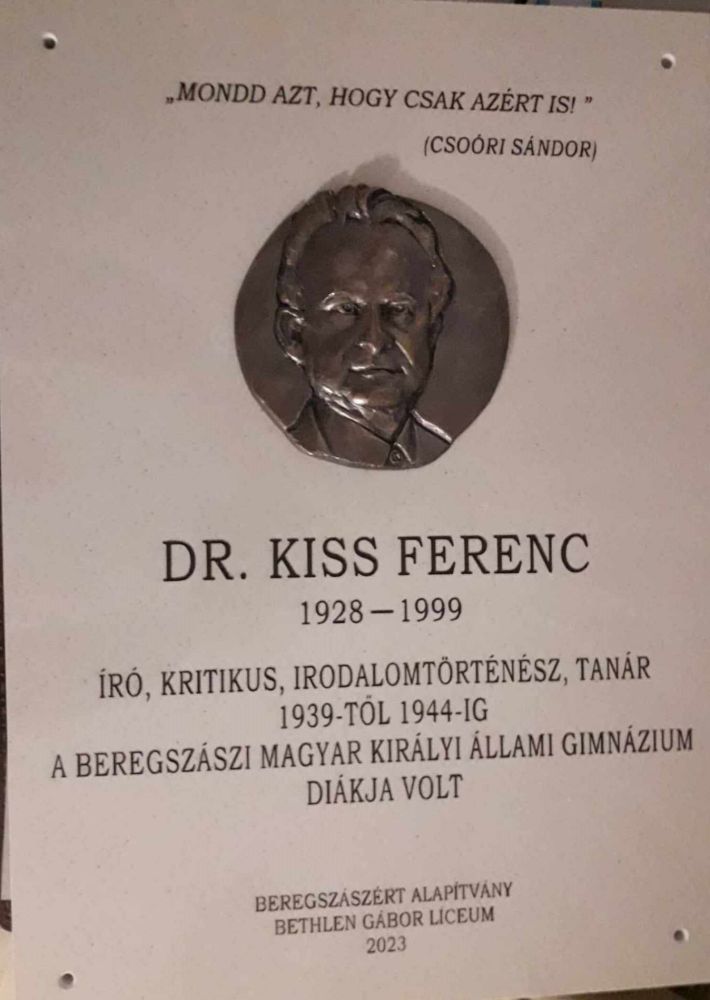 ![November 11-én volt az ugocsai Tiszapéterfalván született dr. Kiss Ferenc irodalomtörténész, kritikus, író, tanár, a Beregszászi Magyar Királyi Állami Gimnázium egykori diákja születésének 95. évfordulója. Ez alkalomból alapítványunk a gimnázium jogutódjának, a Beregszászi Bethlen Gábor Líceumnak ajándékozta az emléktábláját, amely felavatásra vár.]()